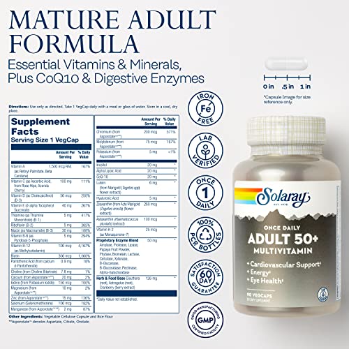 Solaray Once Daily Adult 50+ Complete Multivitamin for Women & Men, Essential Vitamins & Chelated Minerals for Healthy Energy, Heart, Brain & Immune Support, With CoQ10 & Lutein, Iron Free, 90 VegCaps
