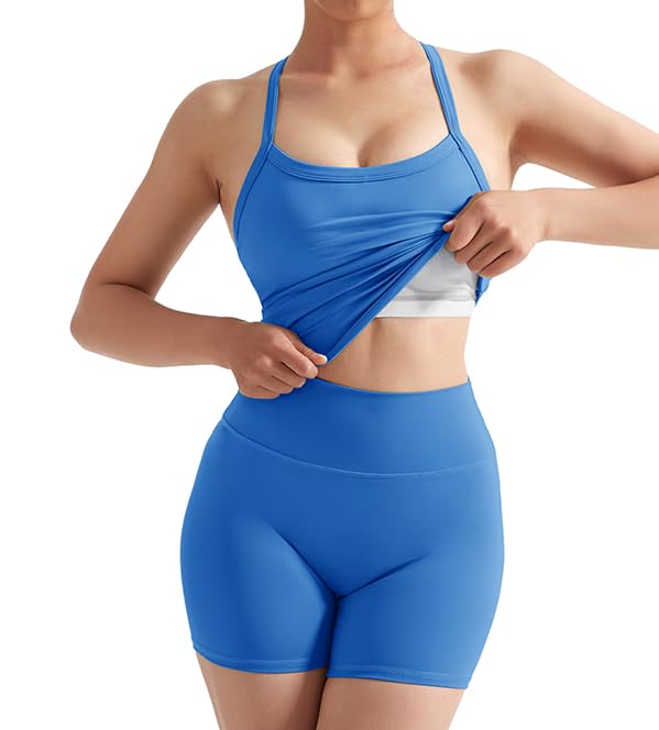 SUUKSESS Women 2 Piece Workout Sets High Waisted Tummy Control Biker Shorts Halter Padded Tank Tops