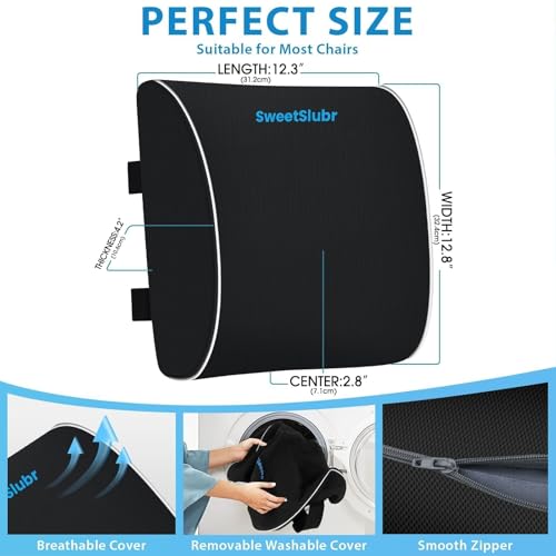 SweetSlubr Lumbar Support Pillow for Office Chair, Car & Gaming Chair, Ergonomic Memory Foam Cushion for Back Comfort, Zoned Back Support, Double Adjustable Straps, Breathable Washable Cover, Black