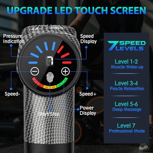 Smart LED Touch Screen: The massager gun is equipped with an intelligent LED touch screen design and battery display design, allowing you to easily adjust the speed level and view the remaining battery.