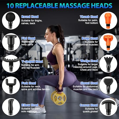 10 Professional Massage Heads: Muscle massage gun with 10 replaceable massage heads, not only helps users calm down more than a few parts of the body, but also is easy to disassemble and clean, making it very suitable for back massage, neck, arm, leg and muscle massage