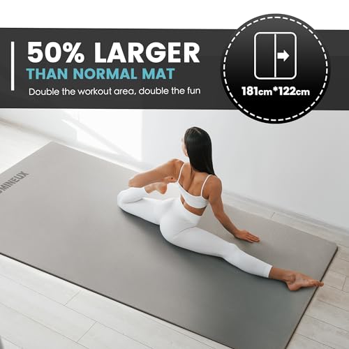 DIMENSIONS: 6’x4’x6mm. This big yoga mat is double the usual-size, which is large enough so that you can change directions without falling off the mat. Transforming your space into a perfect workout area.