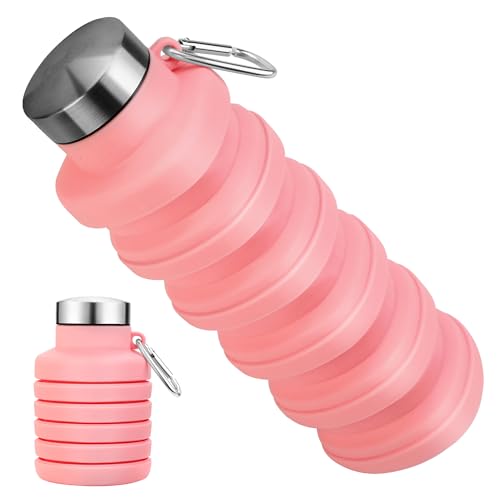 Rotayi Collapsible Water Bottles, BPA Free Foldable Portable Silicone Water Bottles for Traveling Camping Hiking Sports Outdoors, Reuseable,Lightweight,Leakproof -16oz, Pink