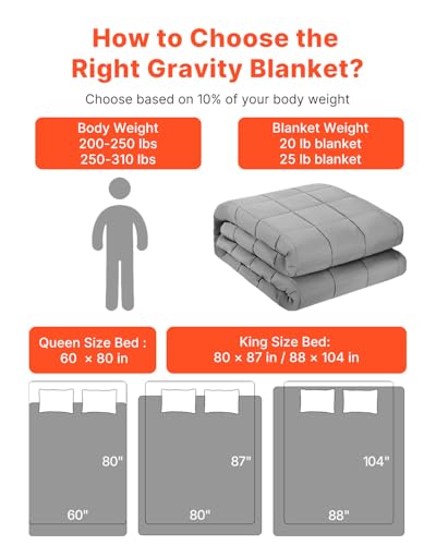 Find Your Ideal Fit: To verify maximum comfort, select a blanket in line with 10% of your body weight. The 20 lbs weighted blanket is ideal for adults weighing 200-250 lbs, and the 25 lbs weighted blanket is ideal for adults weighing 250-310 lbs.