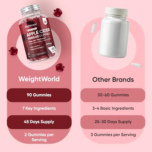 APPLE CIDER VINEGAR GUMMIES 1000MG – Each serving of WeightWorld’s apple cider gummies offers a high-strength 1000mg to easily meet wellness goals. A bottle contains 90 apple vinegar cider gummies with a generous 45-day supply. The daily beneficial dose of our ACV gummies is equivalent to 4 teaspoons of ACV liquid, which will also be taken in just 2 gummies (500mg each). With added 5% acetic acid, these gummies are made of unfiltered liquid ACV with mother, ensuring impressive benefits.