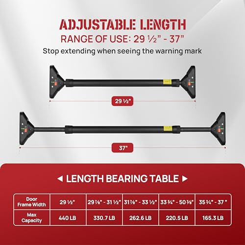NO-DRILLING DOORWAY BAR: Pull-up bar for doorways installs with no screws, using two large 6.5″ x 1.8″ PVC pads for strong high-friction grip; Fits doorframes 29.5″–37″ wide, with weight capacity ranging from 440 LB (29.5″) to 165 LB (37″); Measure doorframe carefully to ensure a snug, secure fit
