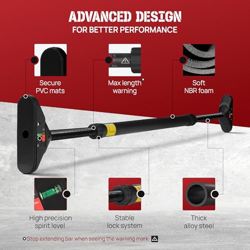 BUILT-IN SPIRIT LEVEL FOR ACCURATE SETUP: Integrated spirit levels on both ends keep the pull-up bar level all through installation; Length markers & max length warning on pull up bar doorway helps properly align bar each time, ideal for beginners in strength training pull-up bars