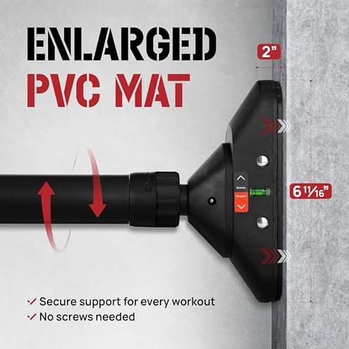 BUILT-IN SPIRIT LEVEL FOR ACCURATE SETUP: Integrated spirit levels on both ends keep the pull-up bar level during installation; Length markers & max length warning on pull up bar doorway helps properly align bar every time, ideal for beginners in strength training pull-up bars