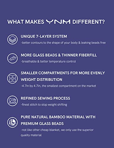 HIGHEST INDUSTRY STANDARD: 4.7”x4.7” smaller compartments for more evenly distribution + The extra two layers design and the three-dimensional lock bead sewing method for 0 bead leakage + Finest stitching(2.5-3mm one stitch) to prevent weight shifting from one compartment to another + superior quality material. All these made a fabulous highest quality YnM Weighted Blanket