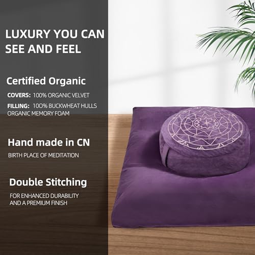 Zafu & Zabuton Meditation Cushion Set – Buckwheat Hull & Memory Foam Pillows, Ergonomic Support for Yoga, Mindfulness – Organic Velvet Cover, Large Size, Durable Comfort (Purple)