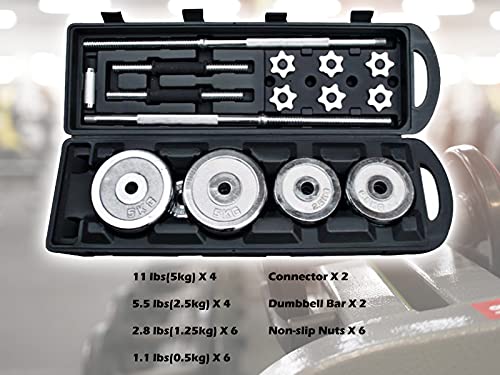 【FREE WEIGHT SETS FOR EXERCISES】This 110 lbs set comes with 20 weight plates: 5kg(11 lbs) x 4, 2.5kg(5.5lbs) x 4, 1.25kg(2.75 lbs) x 6, 0.5kg(1.1 lbs) x 6, and 2 dumbbell bars, 1 connector bar. In addition, our adjustable iron dumbbells set also come with 6 non-slip spin nuts make the plates no more loosen!